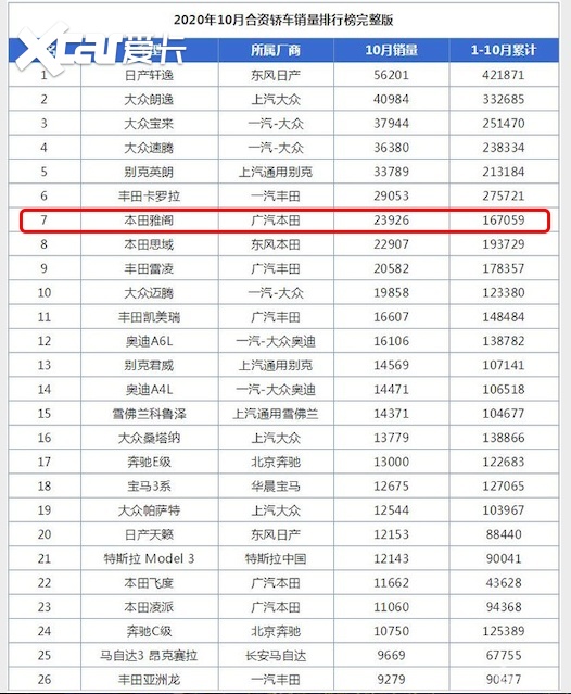 从10月份的轿车销量排行来看,在B级轿车里面,广汽本田雅阁单月销量破2万,稳居B级车桂冠。换代后的十代雅阁运动时尚,外观特别招人喜欢,1.5T SPORT TUBRO涡轮增压发动机带来194匹马力,在同级别里也算是翘楚。同时,十代雅阁搭载的第三代i-MMD 混合动力系统,省油、静谧性和响应性都不错。